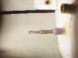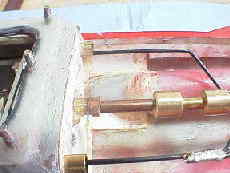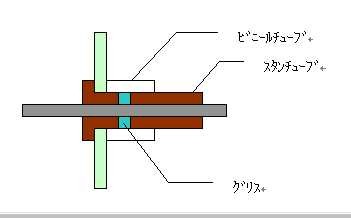 と、言っても銅製のスタンチューブを加えただけです。当初はスタンチューブを半田付けする予定でしたが面倒だったので元々のビニールチューブに約2Cm程の銅パイプを突っ込みました。シャフトは事前に1000番の耐水ペーパーで磨いて凸凹を落としておきます。軸受けとスタンチューブとの間に少し隙間を空けグリス室としました。駆動の際の抵抗も少なく熱ダレも有りません。ついでにビニールチューブがシャフトの僅かな振れも吸収してくれるためスタンチューブの摩耗も少ないです。半田付けしなくてかえって良い結果が出ました。現在水漏れ一切無しです。これが上記の部分の写真です。
