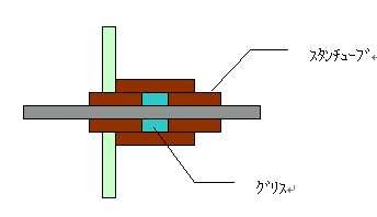 シャフト径2mm。外形3mmのスタンチューブを2分割し外形4mmのチューブを中央に被せて半田付けしてます。スタンチューブを2分割にしたのはグリス室を作るためでこれにより駆動抵抗も減り防水効果が上がります。左右逆になってますが上記の部分の写真です。