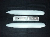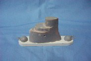 前部のノコギリ状カッターは1mmプラバンを3枚合わせ、中央のギザギザ部分はカッターナイフで少しずつ削り込んで製作。砲塔は、のれん掛け棒の先端の丸い木材を半分に切り真鍮パイプの砲身を差し込んで接着。セールの製作。比較的柔らかいファルカタ材という木を使って大まかに削った所です。その後大体の形に仕上げエポキシをたっぷり塗って木材に染み込ませます。 サフェーサーを塗って研ぎを入れ小さな凹みはラッカーパテで埋めて仕上げます。砲台の部分は発泡塩ビで作りました。