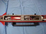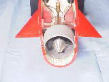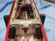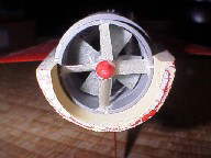 軸流ポンプの作り方吹き出し口を後部より見る。手前にステーターベーン、奥にインペラが有ります。赤いスピンナーは娘のドラエモンゲームのコマを拝借。ばれない内に早く塗装しちゃいましょう。 内部のメカ配置も完了。真ん中の白いのがバラストタンクでポンプはバッテリーの前。バッテリーはそのままでは入らないので上下2段に組み替え。バラストタンクすぐ後ろの黒いのがジャイロです。殆ど隙間無く一杯になりました。受信機等は出来るだけモーターから遠ざけましょうなんて説明書通りにはとても無理ですな。モーター3つも有るもん。